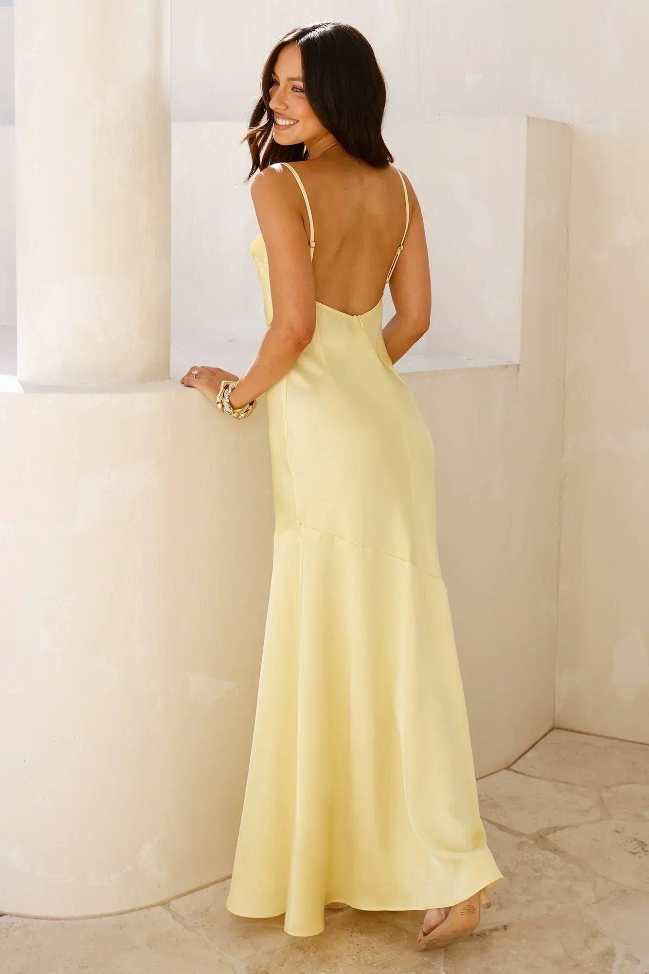 The Brilliant Belle Satin Maxi Dress features a silky satin fabric with a graceful cowl neck and flowy skirt, complemented by an elegant open back. Style it with delicate jewellery and strappy heels for a radiant, sophisticated look.