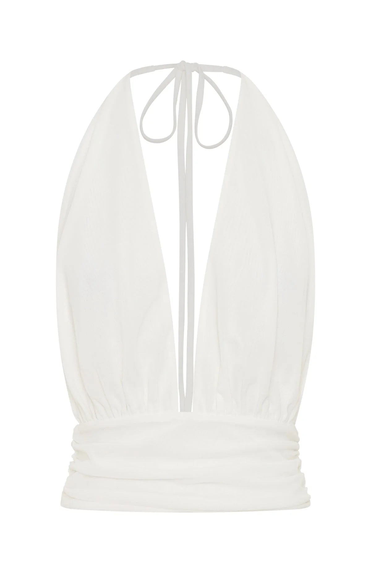 The Dolce DreamsHalter Top in Off White is the definition of sweet and flirty! Features self tie halter straps, low plunge neckline and ruched detailing on bodice hemline. Embrace the sweetness by pairing with the matching Dolce Dreams Halter Mini Skort in Off White.